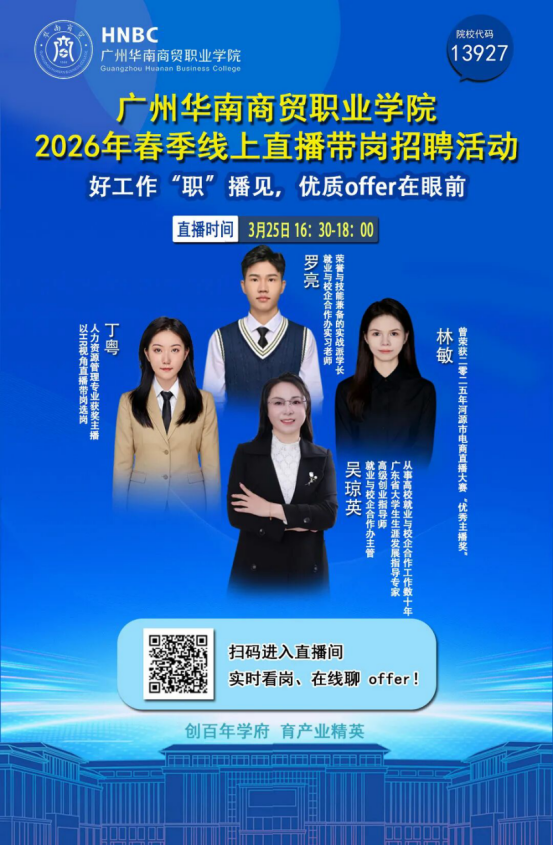 为助力2026届毕业生顺利接轨职场,打通就业“最后一公里”,华南商贸就业与校企合作办组织开展的2026年春季直播带岗活动,重磅来袭!没有套路,全是干货,企业直招、实时答疑、精准匹配,手把手帮你锁定心仪岗位,让求职之路少走弯路、快速上岸!