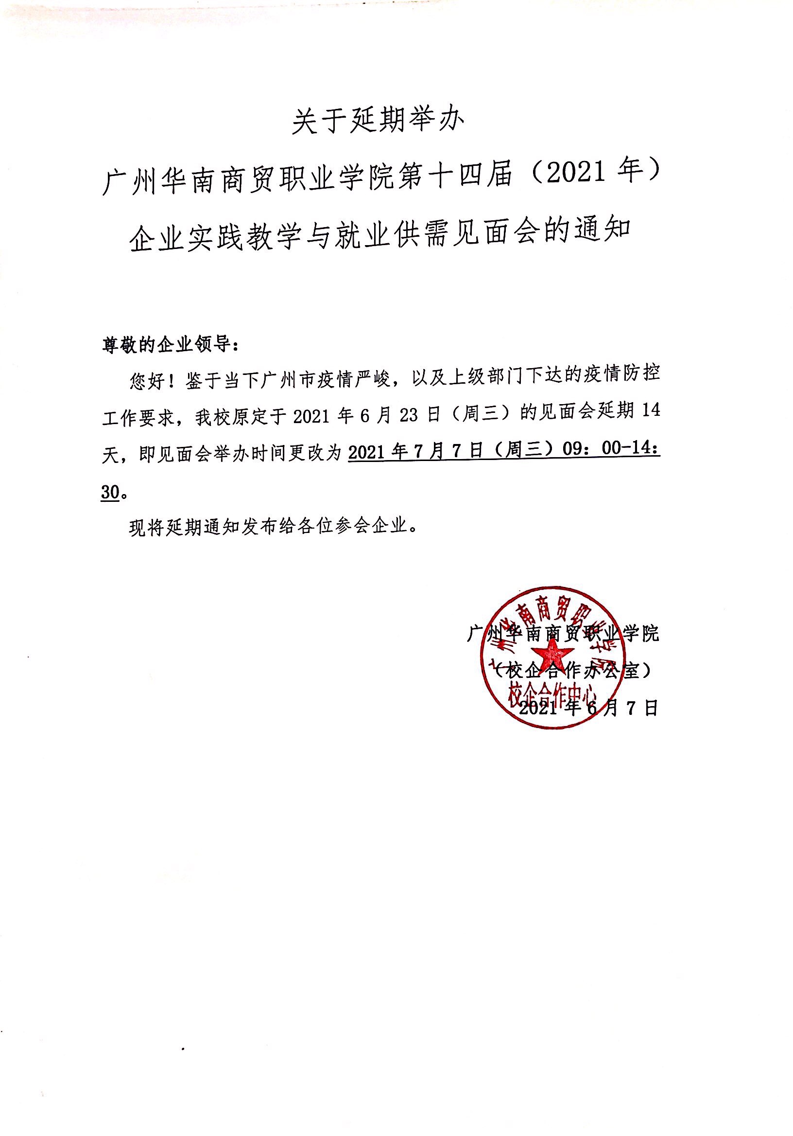 关于延期举办广州华南商贸职业学院第十四届(2021年)企业实践教学与就业供需见面会的通知